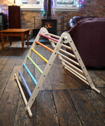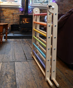 Triclimb folding wooden pikler climbing frame with pastel inspired coloured rungs on one side including purple, blue, green, yellow, orange, pink and natural unpainted rungs on the other side. Features longer natural coloured rungs on the bottom as a base.