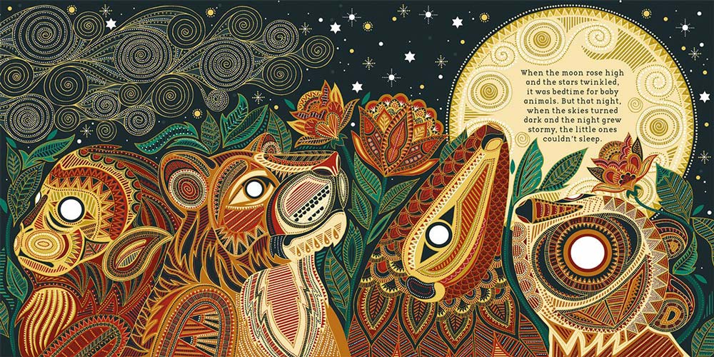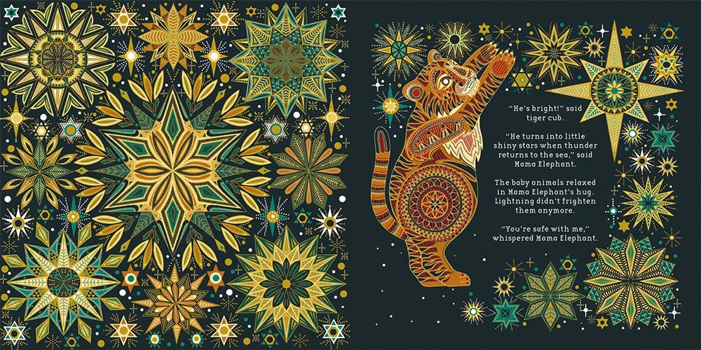 When the moon rises high and the stars twinkle, it is bedtime for the baby animals of the Indian forest. But tonight, when the skies turn dark and the night grows stormy, the little ones can’t sleep. SWISH-SWISH! CRACK-TRACK! FLASH-SNAP! goes the storm. Only Mama Elephant with her words of wisdom can reassure them. “You’re safe with me.”