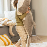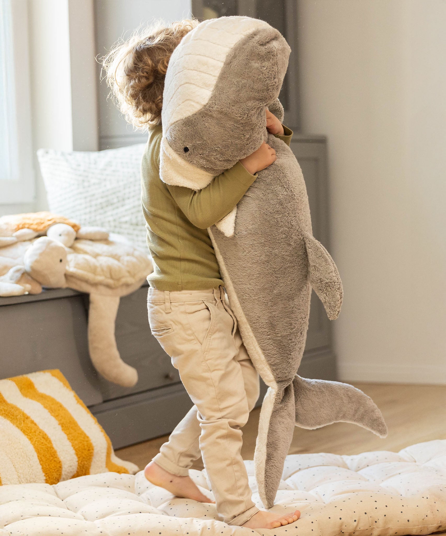 A child playing and holding the Senger Giant grey whale available at Babipur. A soft and cuddly giant whale toy in grey with playful facial features