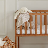 A GOTS organic cotton snowy owl soft toy by Senger available at Babipur sitting upright in a cot showing the cute, sleepy facial features.