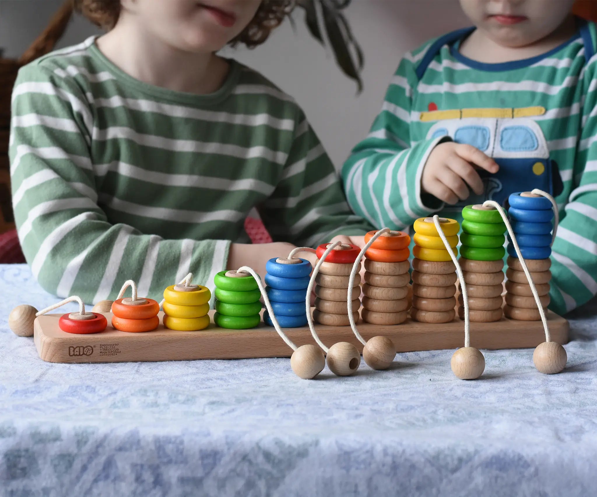 Bajo rope abacus toy with 10 pegs and coloured and natural wooden rings attached with ropes. Children lifting the rings off the pegs.