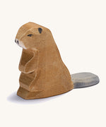 An Ostheimer sitting beaver wooden toy figure in an adult's hand to show scale. Check out our full range of expertly crafted wooden toy figures and scenery here at Babipur.