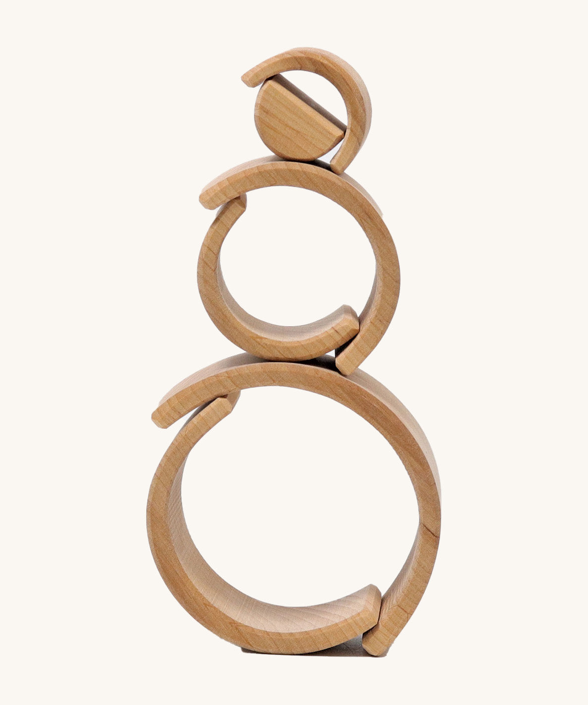 Pieces from the Grimms natural wooden rainbow made into a stack. This  set is available at Babipur.