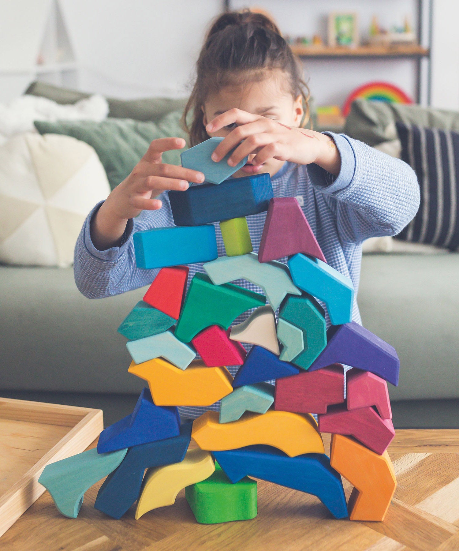 This impressive 61-piece giant wooden block set will look amazing in any playroom and is perfect for creative play. It has a This natural toy will give your child the tools to assemble the Temperaments puzzle as well as create their own stunning landscapes, patterns and creative structures, developing their motor skills, spatial thinking and problem-solving abilities as they play. The pieces are made from sustainable lime wood and finished with child-friendly, non-toxic, water-based colour stain. This natural finish allows the beautiful grain of the wood to shine through, while maintaining a grippy texture that is perfect for building and stacking.