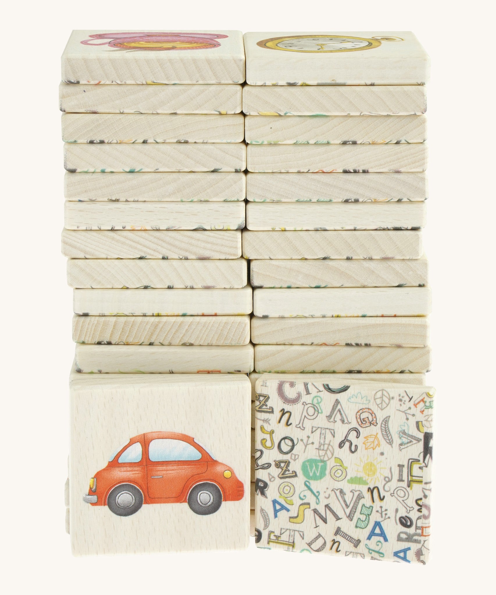 A pile of wooden tiles from the Bajo classic memory game available at Babipur. Showing the different illustrations on the wooden square tiles.