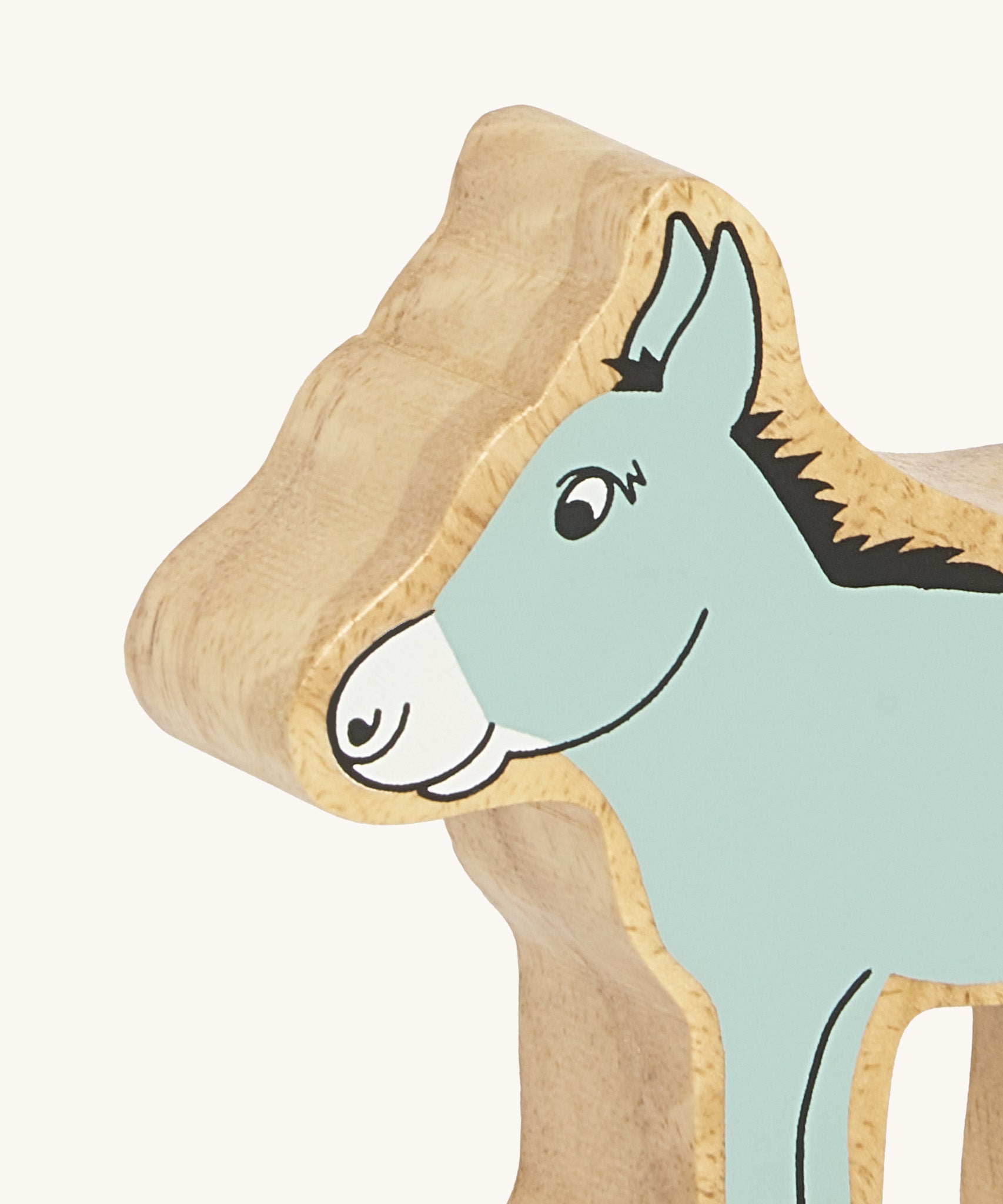 A close up of the chunky wooden Lanka Kade grey donkey animal figure available at Babipur showing its facial features