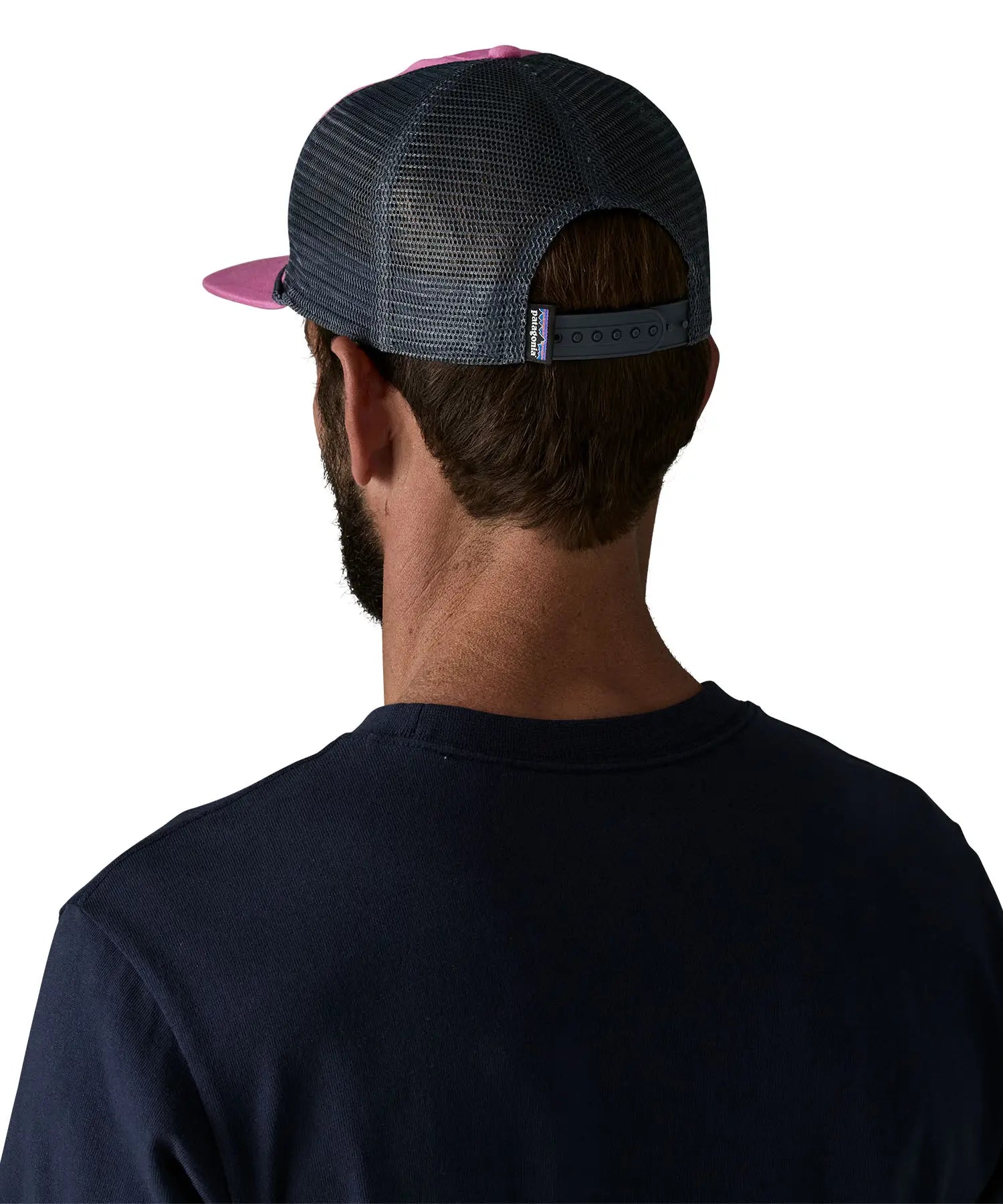 Man wearing wearing Patagonia's airfarer cap in pink with blue mesh back panel shows adjustable strap on the back