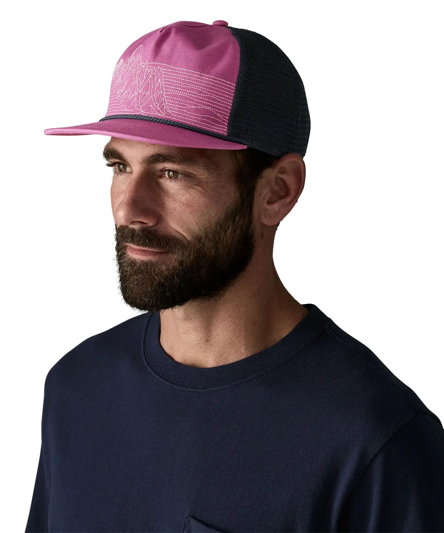 Patagonia airfarer cap in dark pink on the front and dark blue mesh back panel. Shows a stitched mountain design on the front