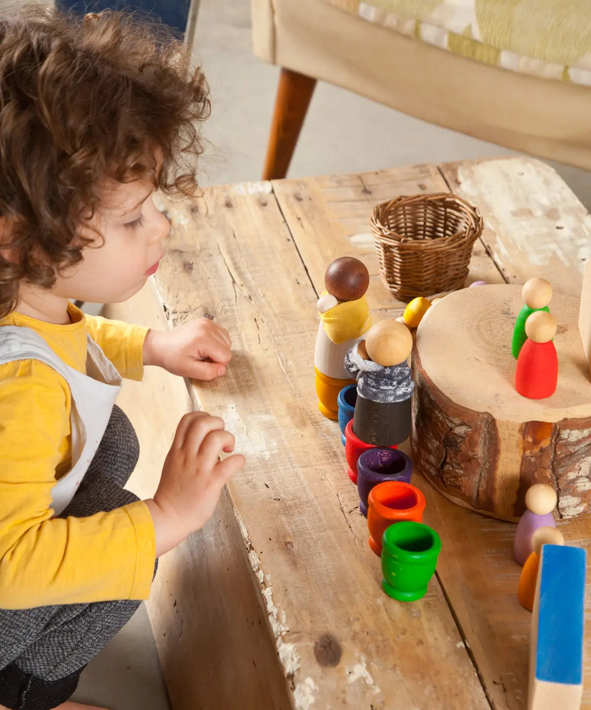 Child sitting next to a creative play setup using Grapat waldorf adult nin peg dolls