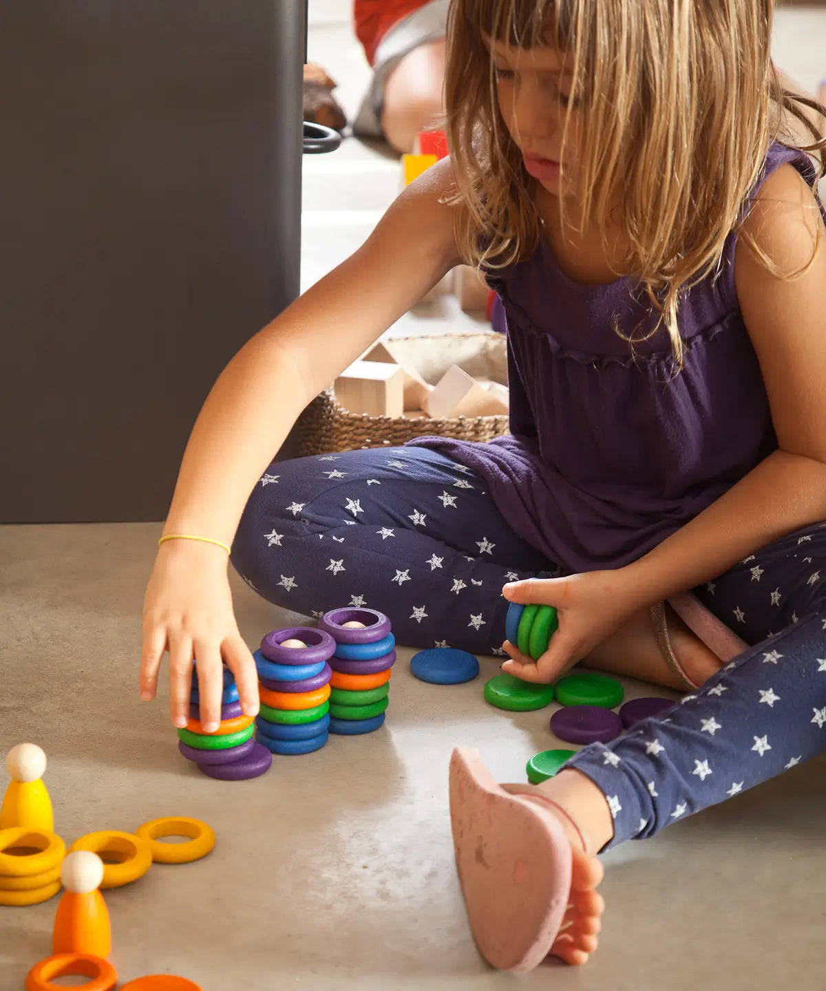 Child stacking Grapat handcrafted coloured wooden rings on a concrete surface