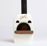 The Bumbu Toys Pizza Oven is a small, eco-friendly wooden dolls house pizza oven model, painted white with flower details in a traditional Romanian design and a roaring fire painted in the back. With an open front, natural wooden sill and black chimney, it's ready to bake pizzas and bread for your dolls.
