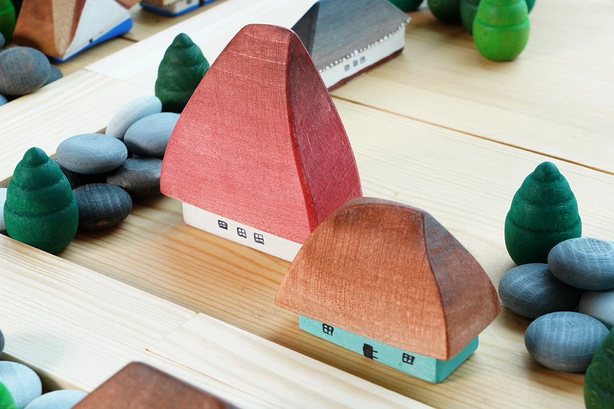 Bumbu Crisana handmade wooden house toys on a wooden table surrounded by grapat mandala trees