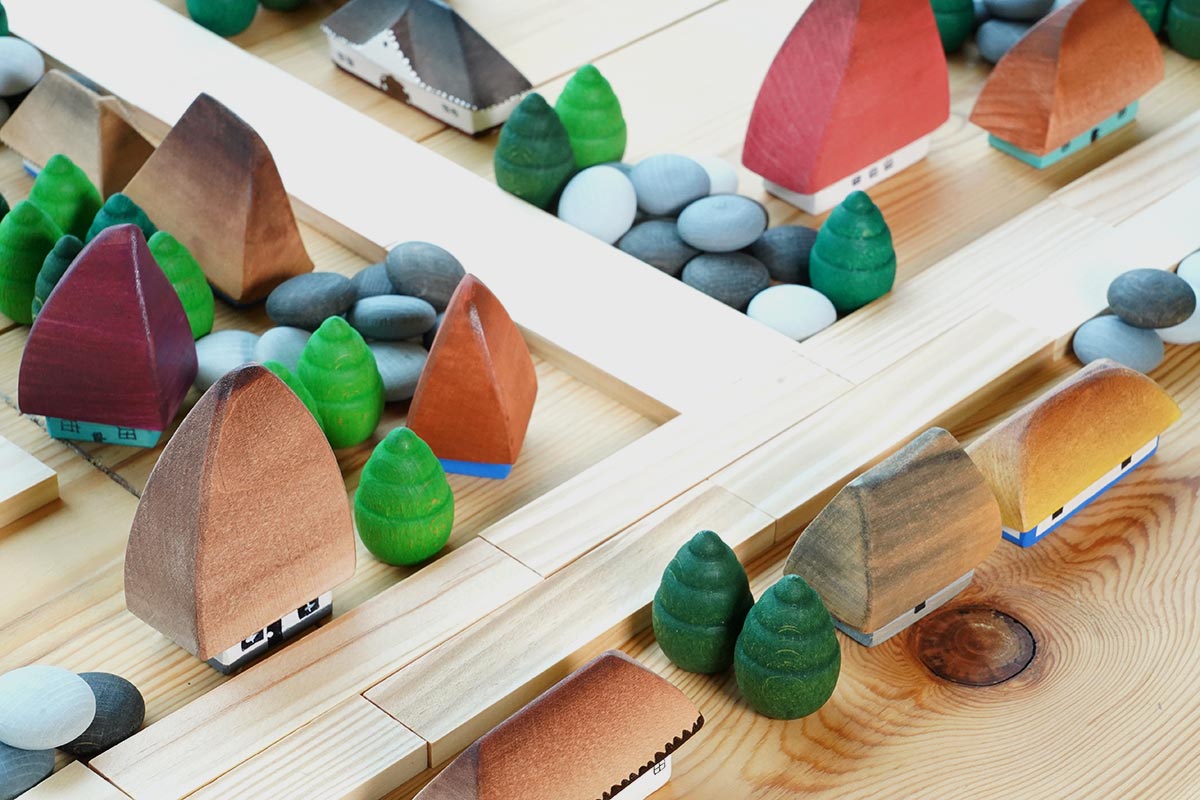 Bumbu handmade miniature wooden house toys laid out in a small town next to some Kapla planks and Grapat mandala pieces