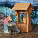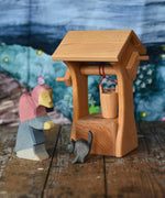 An Ostheimer wooden water well with roof toy placed on a wooden surface with an Ostheimer witch and black car for witch figure. A Wonderie wondercloth can be seen in the background. These wooden figures are part of a wide range of expertly hand crafted wooden toys here at Babipur.