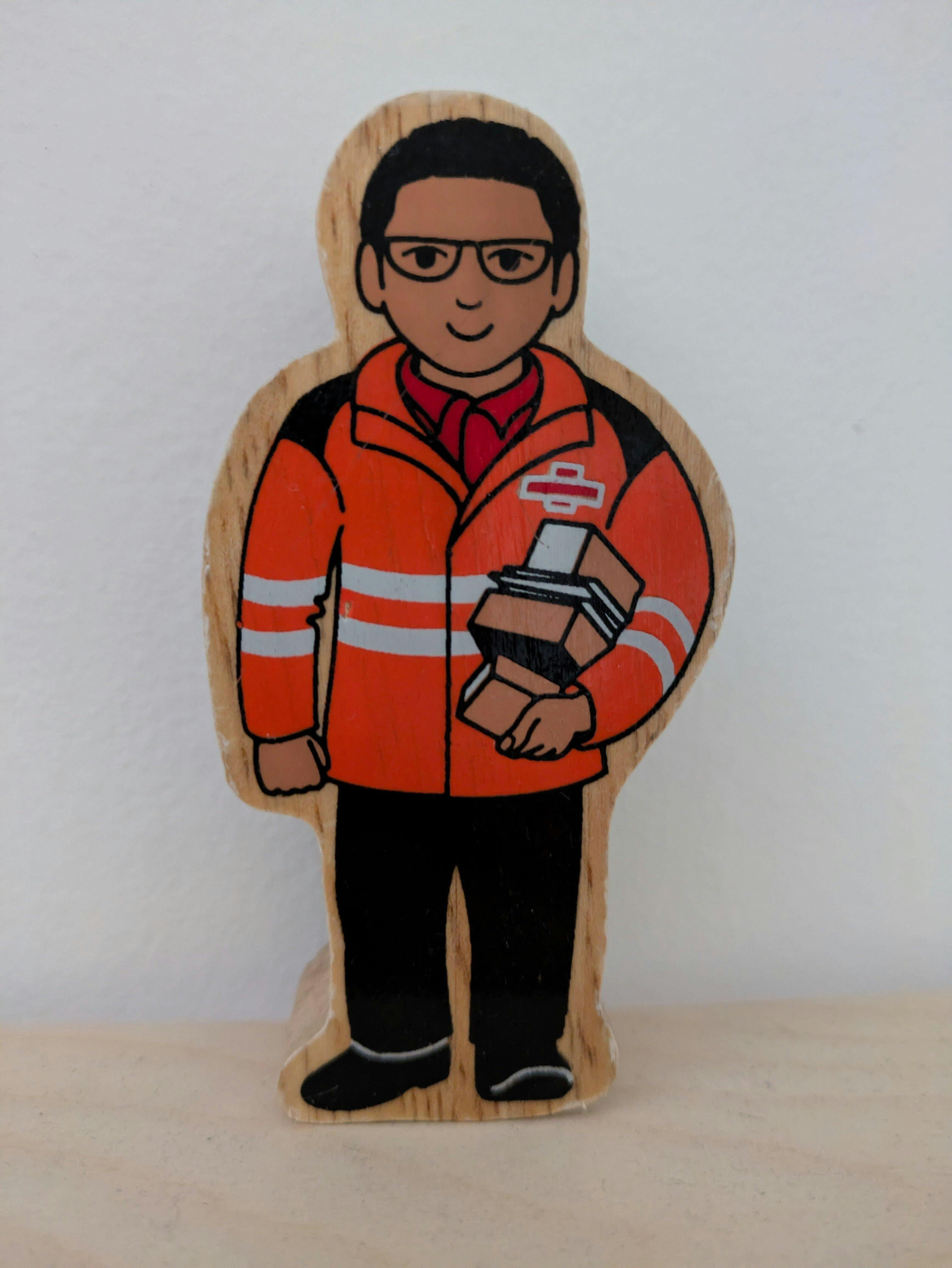 Teach your little ones about different professions with this Lanka Kade Orange & Black Delivery Person - this is a friendly figure painted with an orange gown jacket and a red shirt underneath and black trousers holding a few parcels in their arm. The delivery person also has glasses and is designed on both sides. The edges of this natural wooden toy have been left unpainted to show off the beautiful wooden grain. This chunky wooden toy is perfect for teaching small children about real world people and how they help in their professions. Team up with other Lanka Kade wooden figures to create bright, fun and colourful play sets that'll provide ours of entertainment to your little ones.