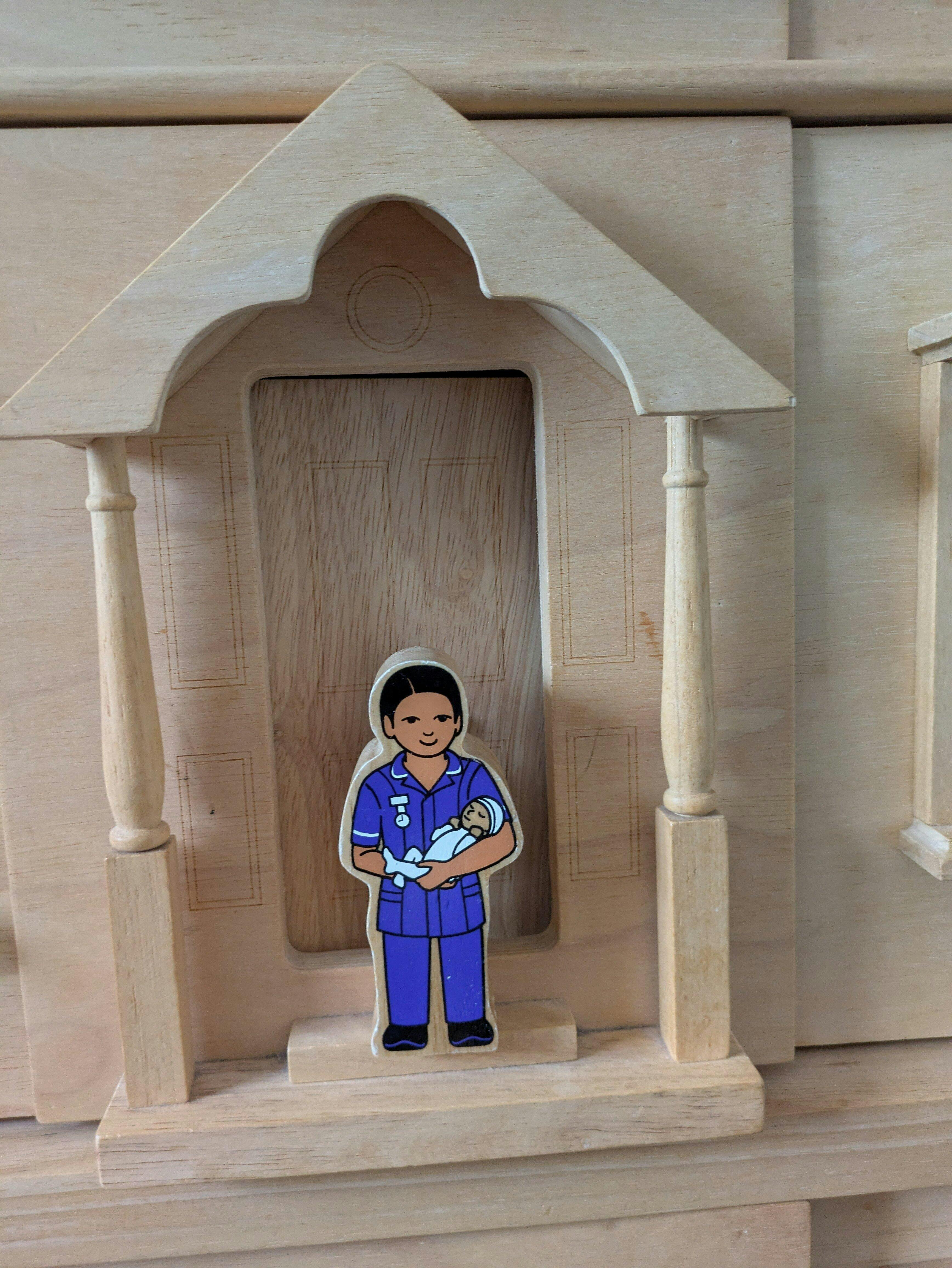 Teach your little ones about the important people who help deliver babies with this Lanka Kade Purple Midwife - this is a friendly figure painted with a purple gown and purple trousers holding a newborn baby. The Midwife is designed on both sides of the wood. The edges of this natural wooden toy have been left unpainted to show off the beautiful wooden grain. This chunky wooden toy is perfect for teaching small children about real world people and how they help in their professions. Team up with other Lanka Kade wooden figures to create bright, fun and colourful play sets that'll provide ours of entertainment to your little ones.
