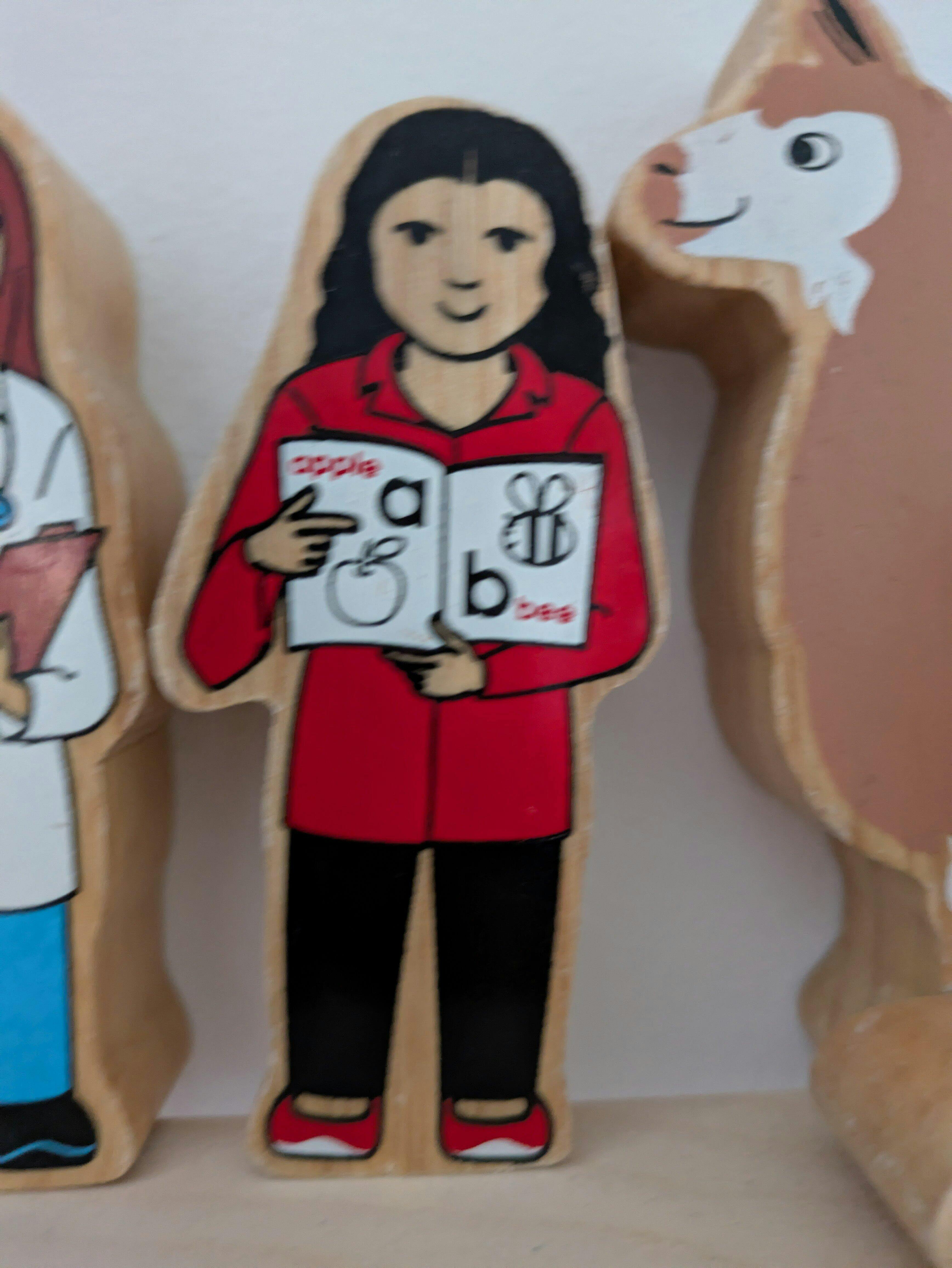This Lanka Kade Red & Black Teacher is a friendly figure painted with a red top and back trousers holding an open book to their students. The Teacher has their hair down and is designed on both sides. The edges of this natural wooden toy have been left unpainted to show off the beautiful wooden grain. This chunky wooden toy is perfect for teaching small children about real world people and how they help in their professions. Team up with other Lanka Kade wooden figures to create bright, fun and colourful play sets that'll provide ours of entertainment to your little ones.