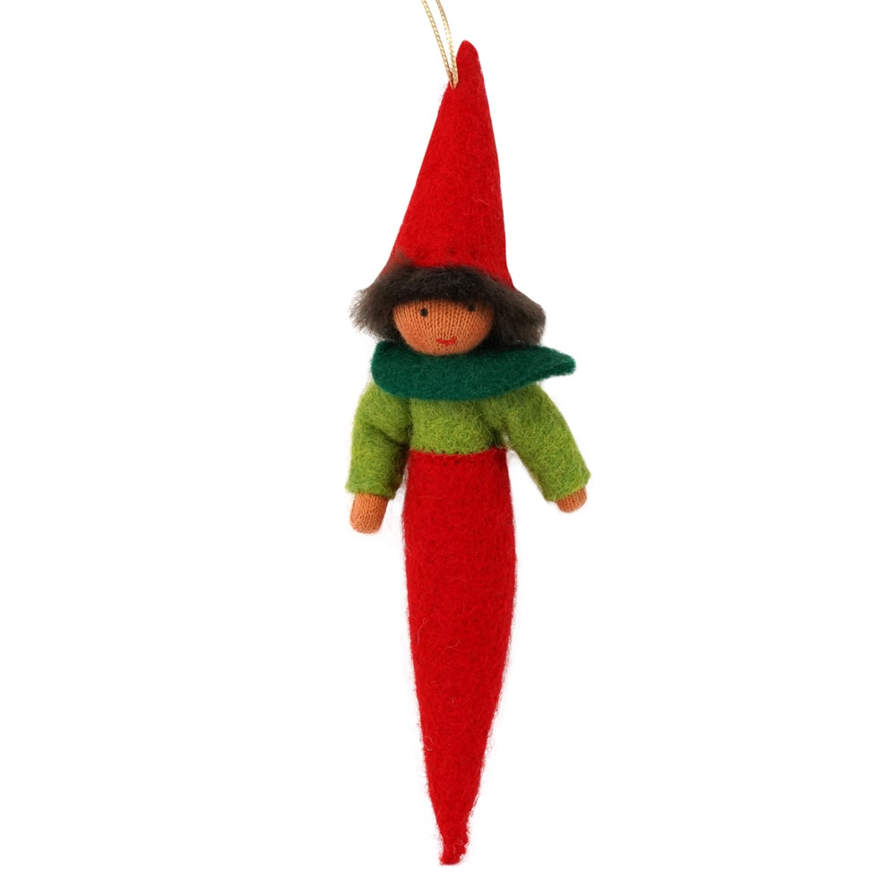 This felted wool pixie is a really cute Christmas decoration that children and adults will love to have hanging from the tree. This elfin Christmas tree decoration is wearing a green top and red tall cap, and is tucked up into a red sleeping bag. This traditional Christmas decoration has a gold thread loop for hanging from a Christmas tree, or elsewhere in your home year-round.