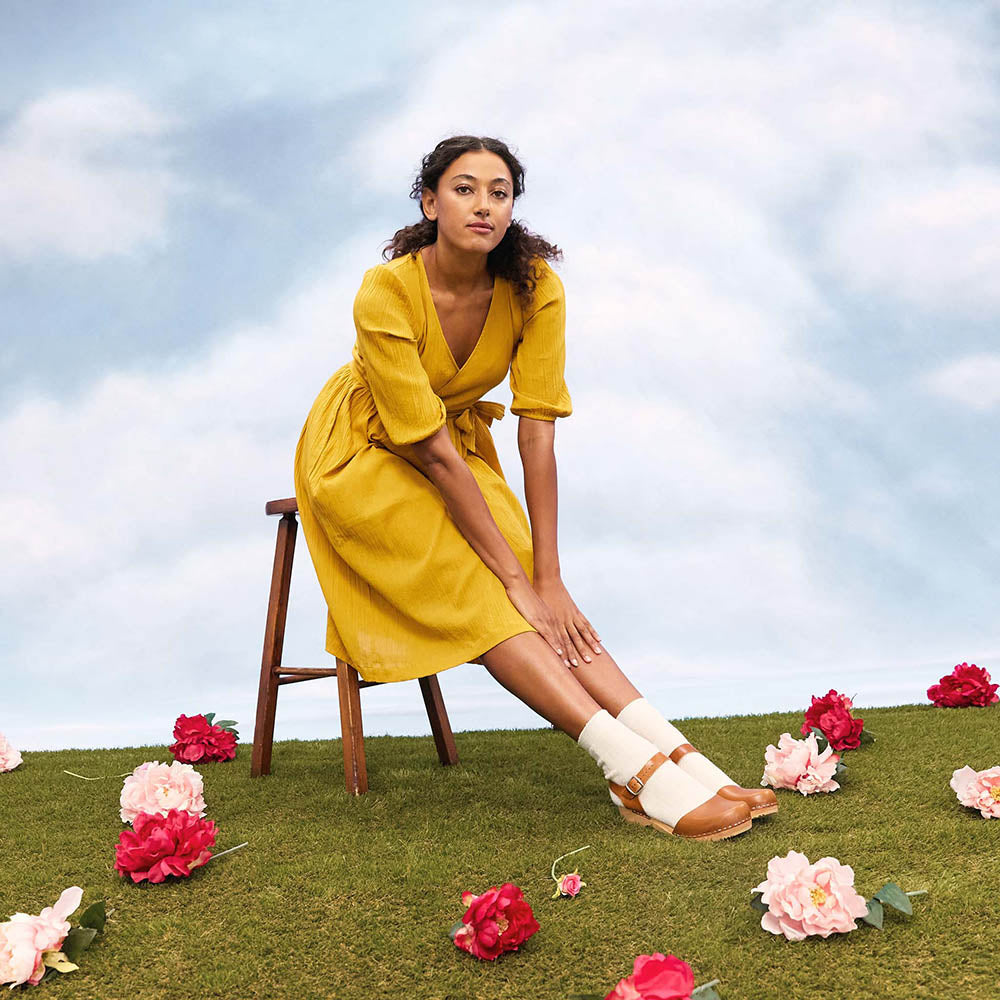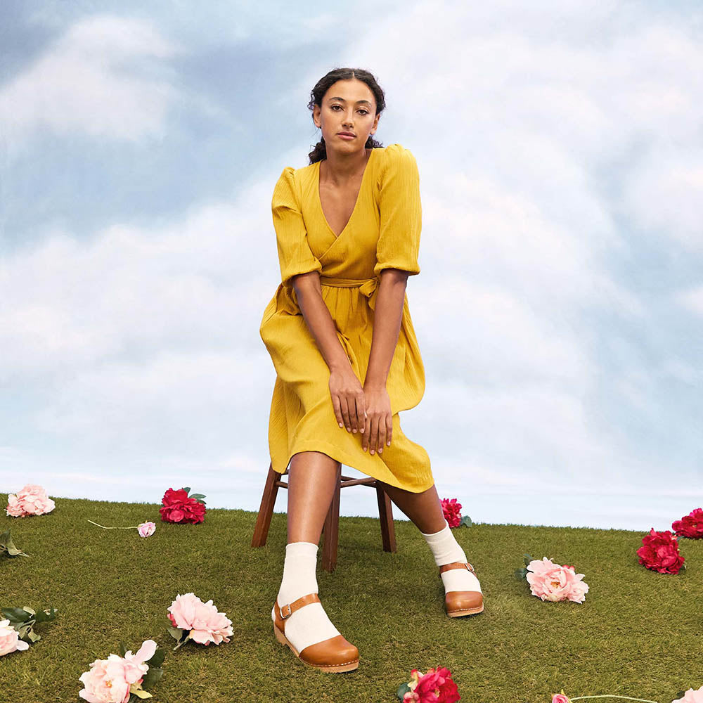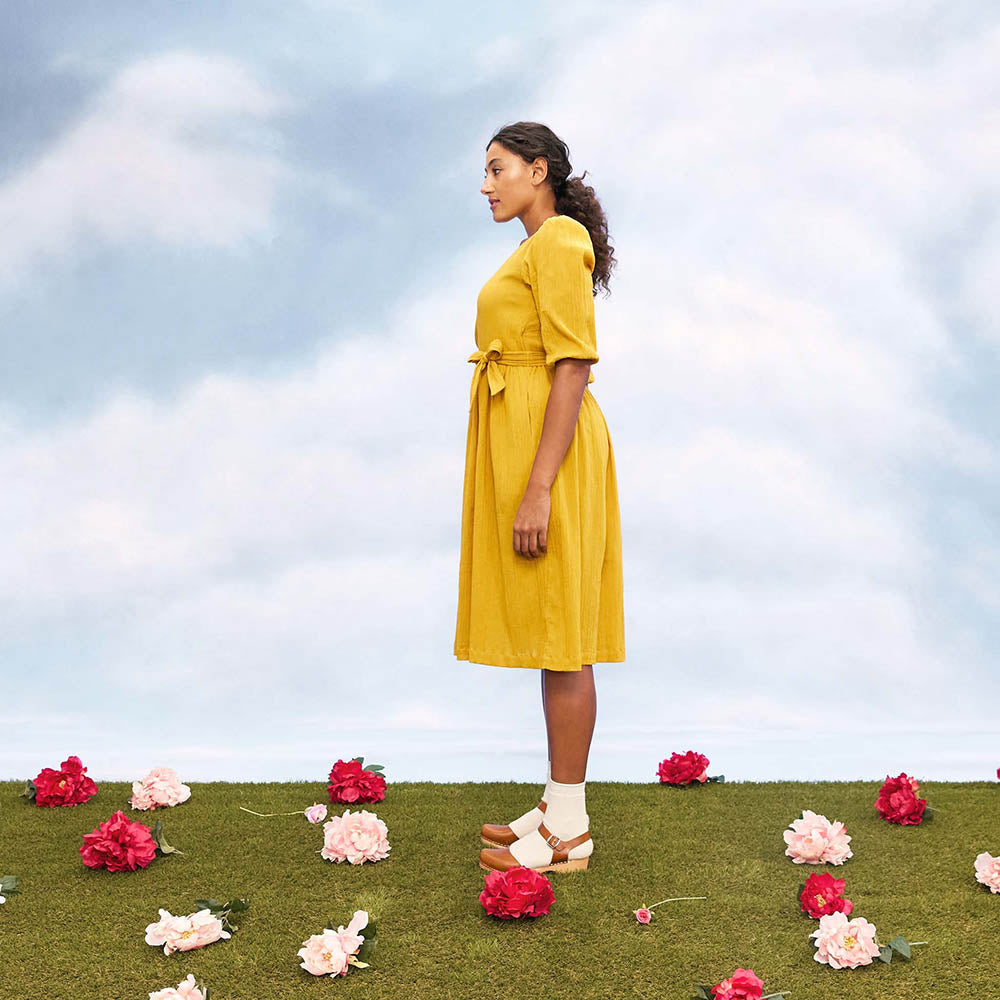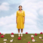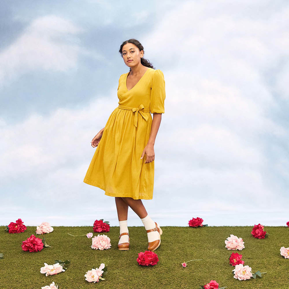 With classic vintage vibes, the Flora Mustard Organic Cotton Wrap Dress by Olli Ella is a soft rich mustard yellow organic cotton wrap dress for adults.