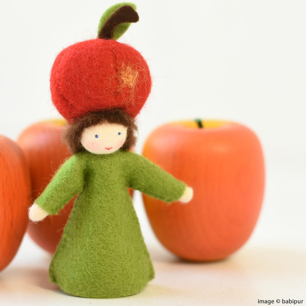 This fair trade felted wool decorative figure is an adorable flower fairy for an autumnal seasonal table. This small Waldorf doll has light skin, brown hair and is wearing a green gown with a crunchy red apple for a hat. Pop on a seasonal display table with conkers, fallen leaves and autumn finds. Flex this doll's arms into position and stand up right.