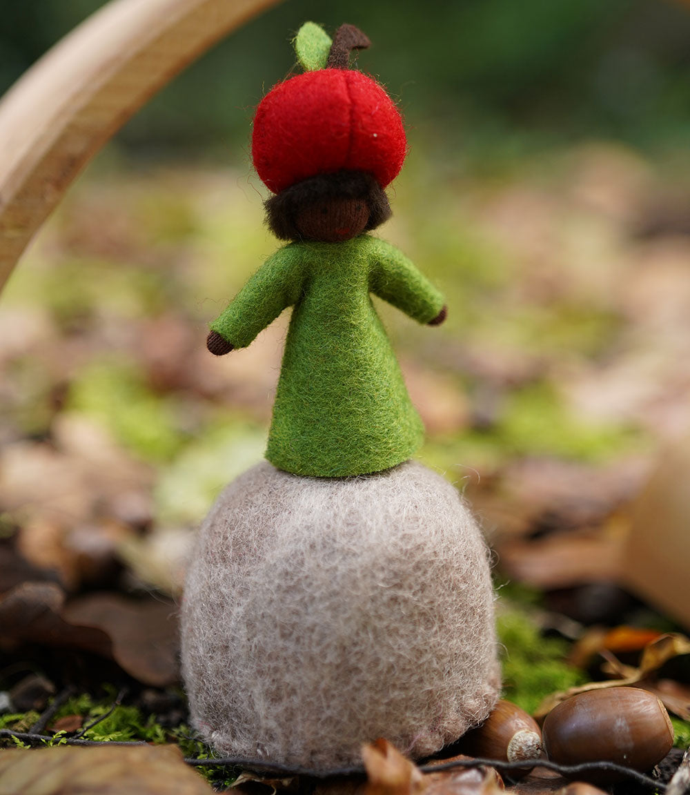 Celebrate autumn with this Ambrosius Apple Crown Fairy - a fair trade felted wool decorative figure. This small Waldorf doll has Black skin, brown hair and is wearing a green gown with a crunchy red apple for a hat - it makes an adorable flower fairy for an autumnal seasonal table. Pop on a seasonal display table with conkers, fallen leaves and autumn finds. Flex this doll's arms into position and stand up right.