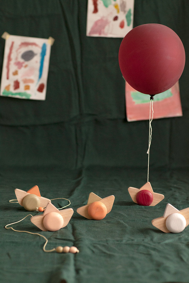 Babai sustainable wooden pull and go ship toys spread out on a green sheet below a red balloon