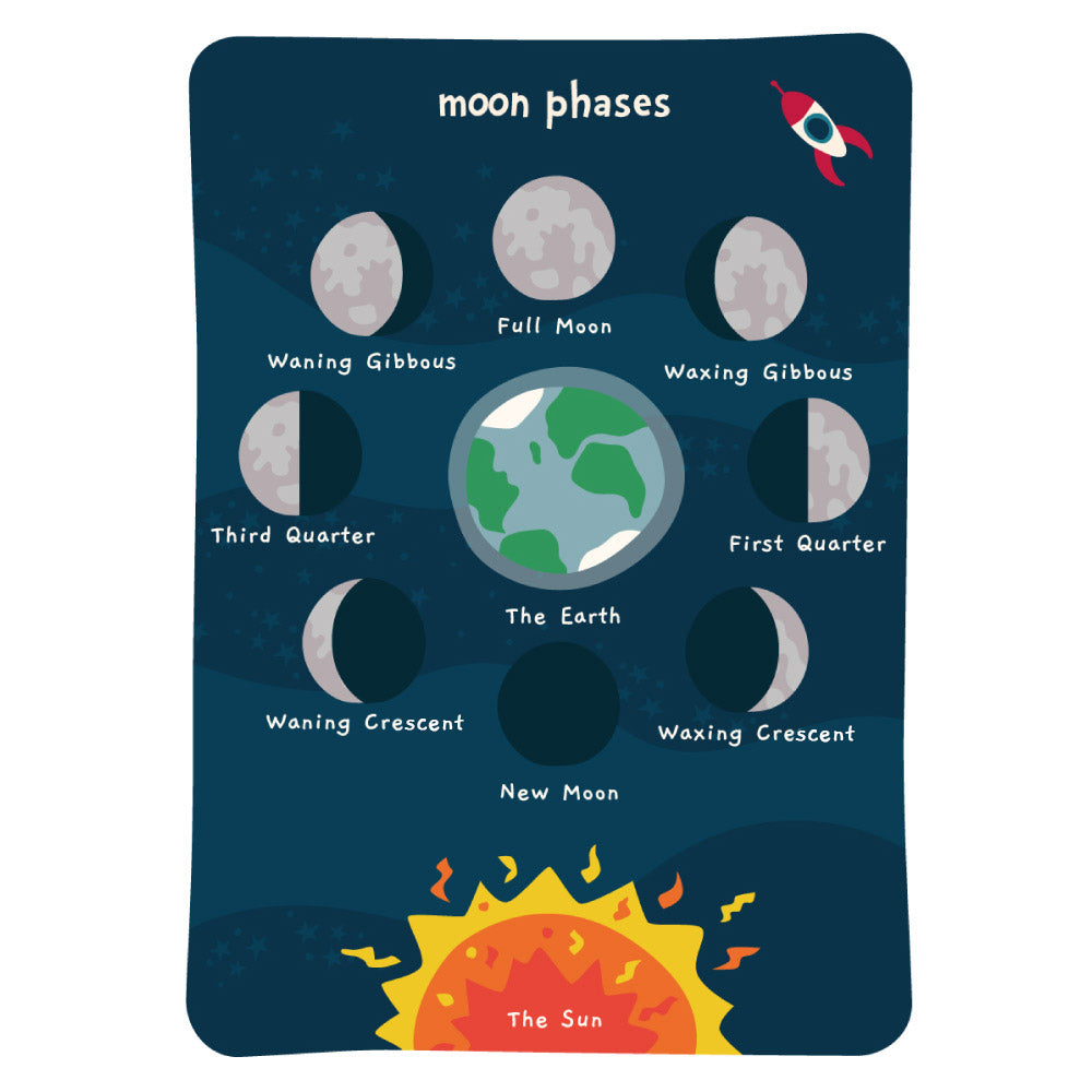 This art print is a wonderful way to encourage curiosity about the planets and space. The basic principle of moon phases is presented in a way that’s easily digested by young children and will spark conversations and discovery.