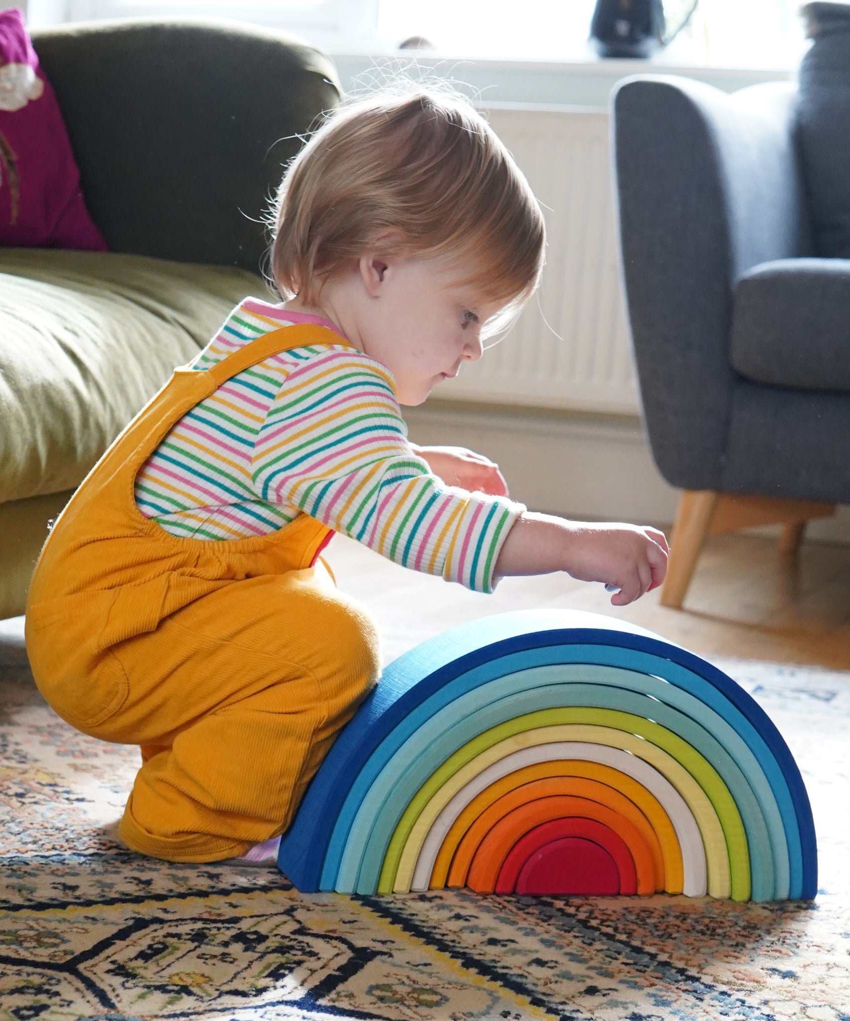 A child crouching down besides the Grimm's Gwawr Sunrise 12 Piece Rainbow.