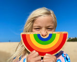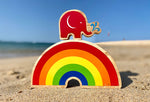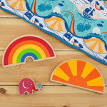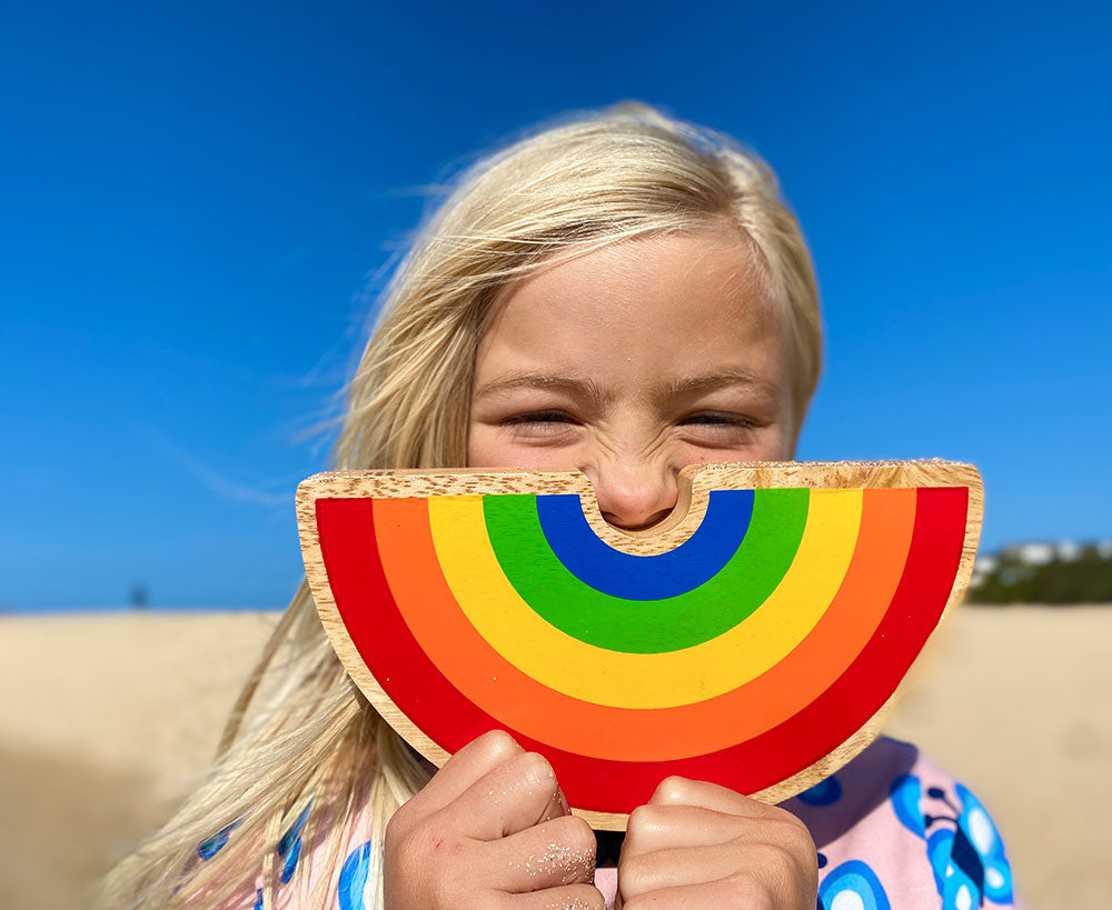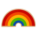 This Babipur X Lanka Kade Rainbow is a wonderful wooden toy rainbow with six bold rainbow colours that will make a fabulous addition to your play scenes. This special collaboration between Lanka Kade has been designed in house here at Babipur Towers and made by the artisans of Lanka Kade under Fair Trade conditions in Sri Lanka. The Lanka Kade Babipur rainbow is a chunky semi-circle that's painted on both sides in bold stripes of red, orange, yellow, green and blue with natural edges. This rainbow would be great for weather themed play and including in toy farm or safari sets. Use with walls, gates, trees and wooden animals for a fun play set, and enjoy its natural beauty on the playroom shelf.