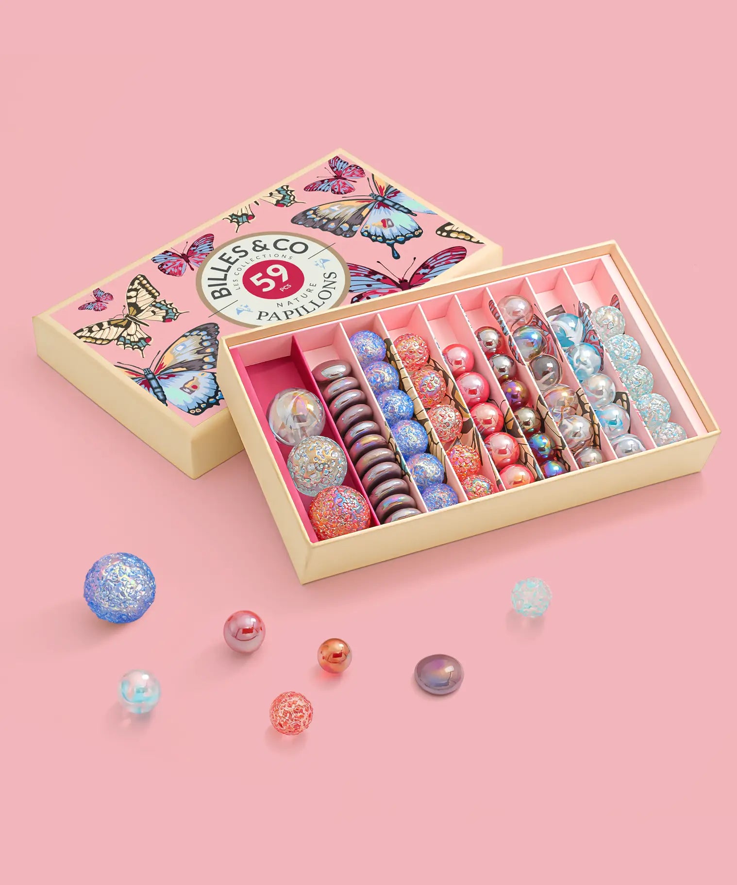 Billes & Co butterfly anamorphic marble set presented in a butterfly decorated box. Showing 71 different sized marbles in bright pastel colours