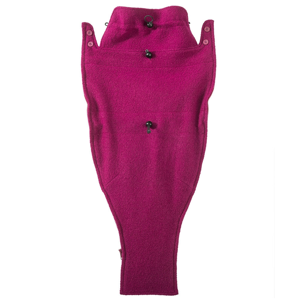 Mamalila Wool Hooded Babywearing Coat in a striking bright berry colour. This coat includes two zip-in panels, one for wearing when pregnant and one for wearing over a baby carrier but without the panels its just as stylish and well fitting. This Mamalila boiled wool coat has a slim fit, funnel neck and deep, practical pockets. It has a smart style that's perfect for wearing to work but is practical for country walks and the school run too.