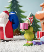 A Christmas scene including the Bumbu Santas elf holding a present, the Bumbu Santa and Christmas trees