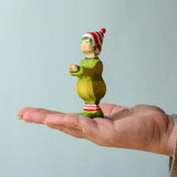 A hand holding the wooden Bumbu Santas elf wearing a red and white striped hat and a green outfit with its hands holding out to carry presents.