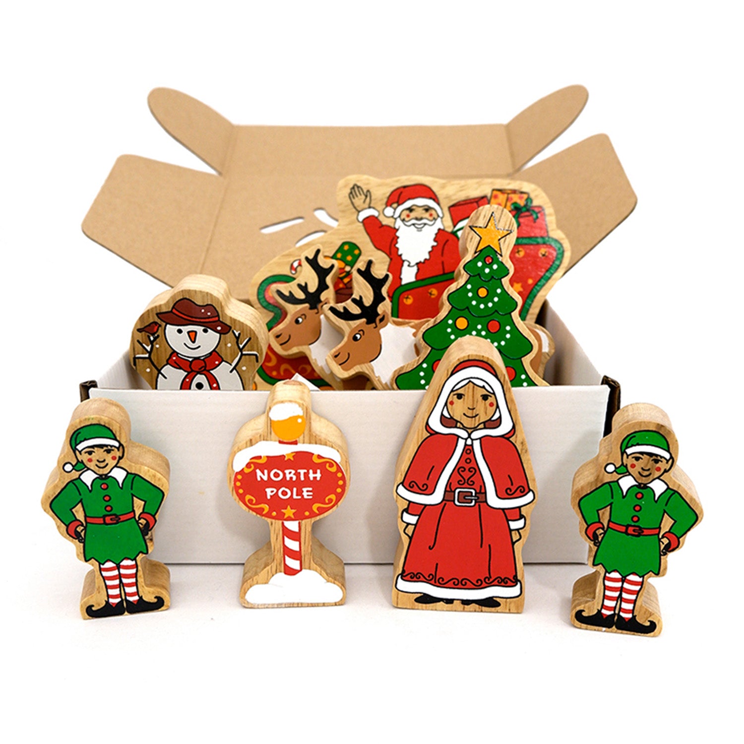 All your favourite Lanka Kade Christmas Characters in one box! This complete set of 9 Lanka Kade wooden toy xmas figures includes Santa in his sleigh, Mrs Clause, Christmas Tree, Snowman, North Pole Sign, 2 Elves and 2 Reindeer. Perfect for festive play during Christmas, this set comes in a plain cardboard storage box.