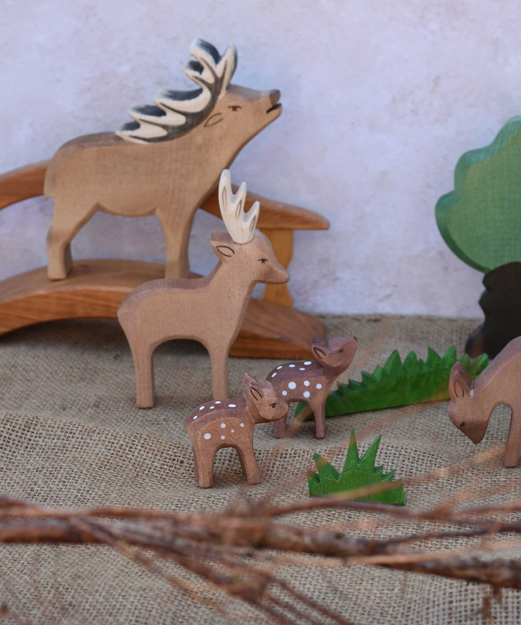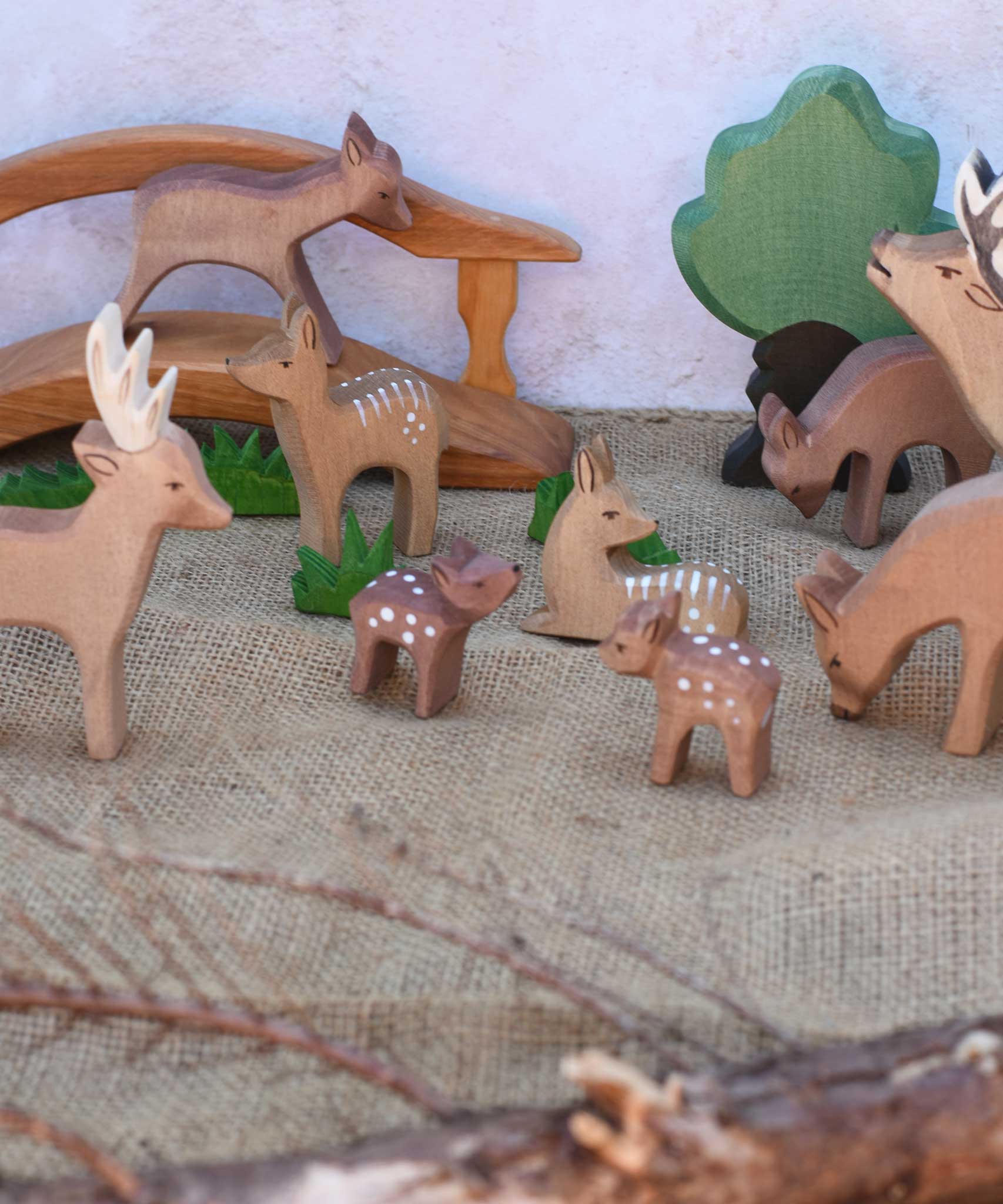 A collection of Ostheimer deer and fawn wooden figures placed in a small world play scene set up with a wooden toy bridge, oak tree and green grass figures. Check out our full range of expertly crafted wooden toy figures and scenery here at Babipur.