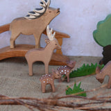 A collection of Ostheimer deer and fawn shown in a small world play scene with a wooden toy bridge and trees and branches. Check out our full range of expertly crafted wooden toy figures and scenery here at Babipur.