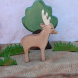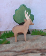 An Ostheimer male deer toy figure placed in the middle of a small world play scene. Ostheimer grass an oak tree figure can be seen in the background. Check out our full range of expertly crafted wooden toy figures and scenery here at Babipur.