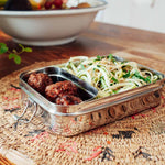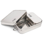 This two in one, stainless steel lunch box from Elephant Box is perfect for enjoying a plastic free, zero waste lunch. The set contains two food grade stainless steel boxes, the larger of the two has a large 800ml capacity and the snack pod has a 200ml capacity and sits nicely inside the bigger box - perfect for keeping your sarnies and snacks separate. Each box is highly durable and made from 100% food grade stainless steel which won't stain or carry odours from your last lunch. The larger box lid is secured with a roller clamp on either side which gives a girm close and is super easy to open.