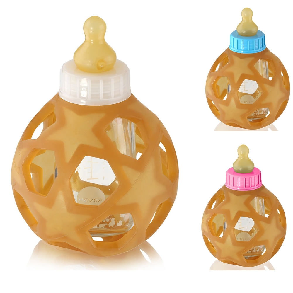 This glass baby bottle by Hevea has a natural rubber star shaped cover that is easy for little hands to hold and prevents breakages. Choose from a natural, pink or blue screw thread top.