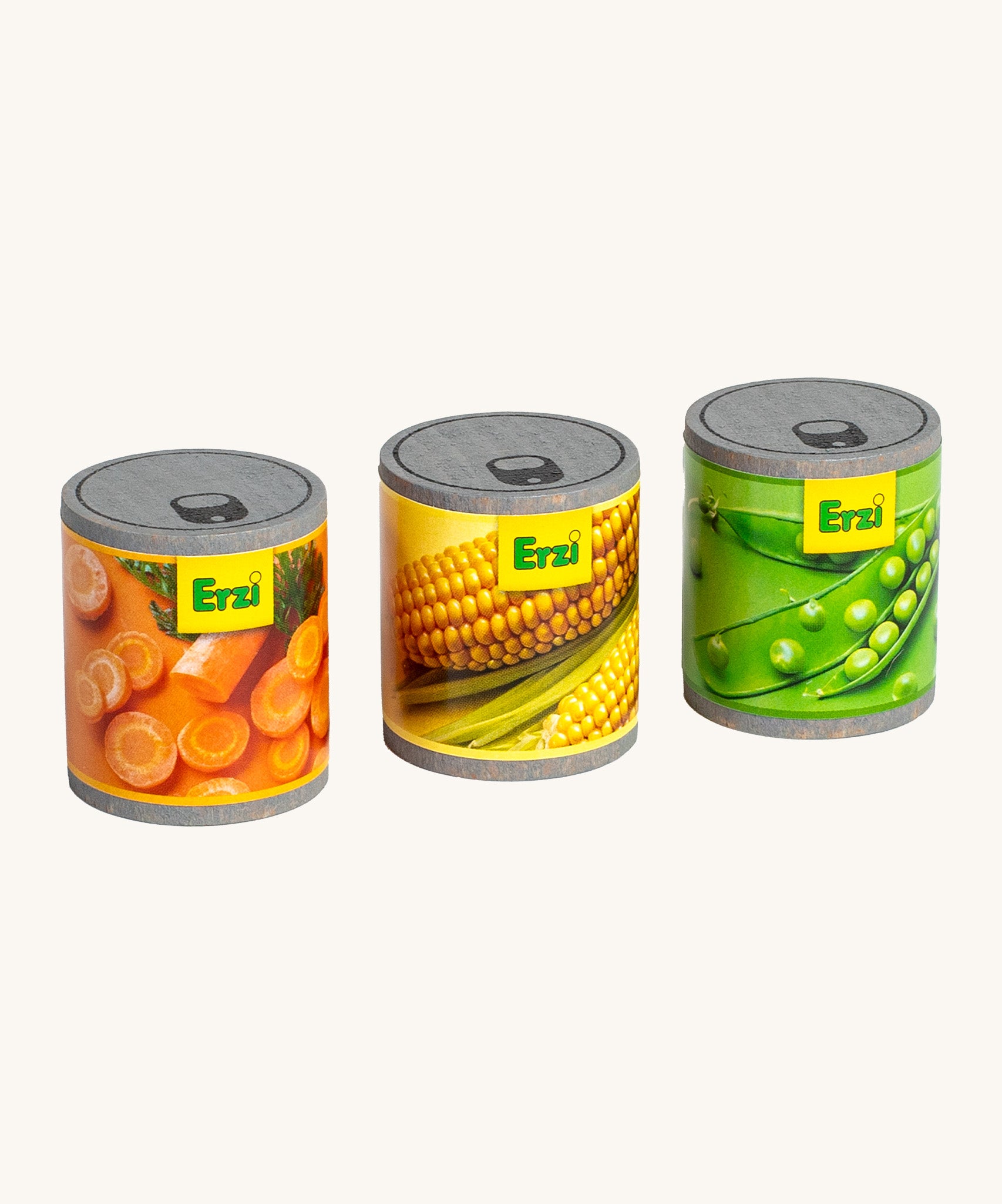 All your favourite vegetables in tins by Erzi, featuring 3 wooden tins of peas, sweetcorn and carrots in realistically branded tins. These tinned veggies are perfect for imaginative play, stocking up the play shop or kitchen.