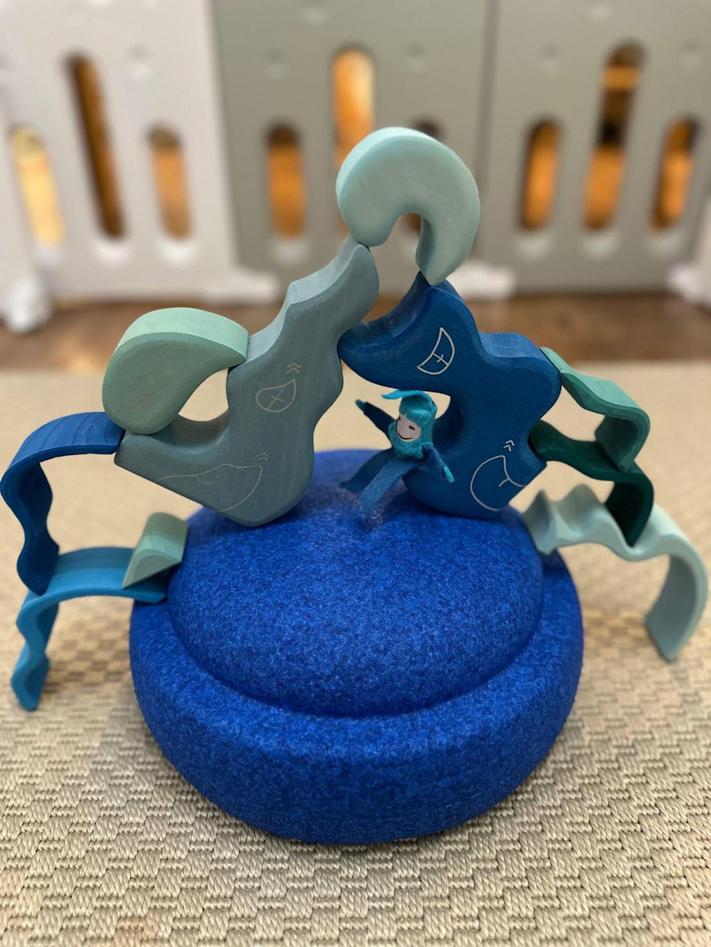 Splash out on this mini waves set. This versatile natural toy is small but perfectly formed - a set of six wooden waves, each a different shade of blue. Split them up and sit them on top of a blue scarf to make a choppy sea, or balance them on top of each other to make giant waves. They are perfect for playing with the Grimm's land yacht set and young children will enjoy stacking, sorting and building with the waves for years to come. They make excellent tunnels for toy cars, farm fences and adventure playgrounds for dolls, and will brighten up any mantelpiece when they are eventually outgrown. Steiner educators will love this multi-purpose educational toy that can be used for natural play in a myriad of ways.