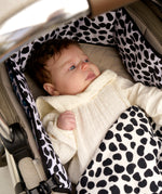 Reversible print, 'Dalmatian' is a bold high contrast black and white design (0-4 months print), while 'Blue Leopard' includes dark blue, light blue and cherry pink (5+ months print).