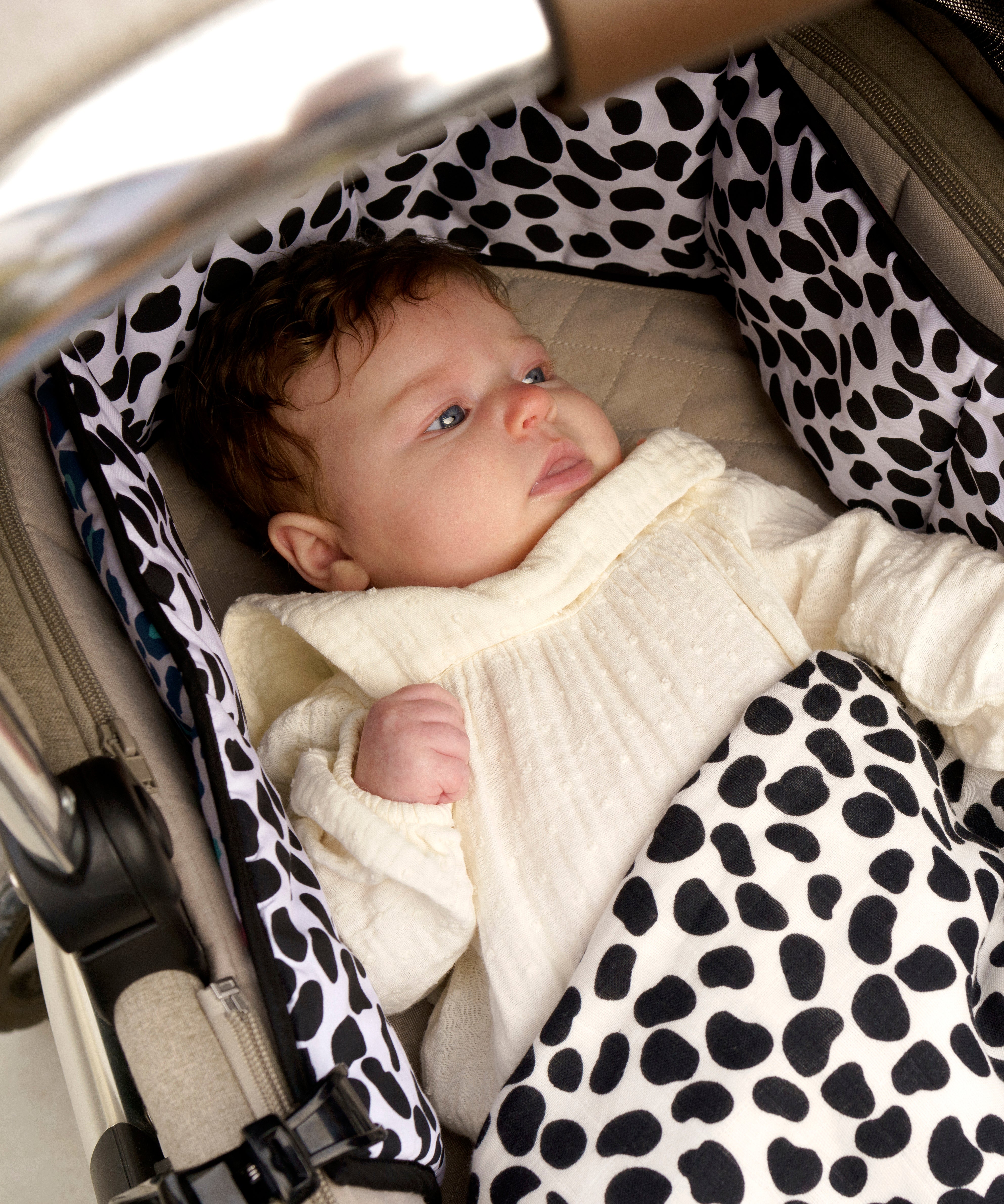 • Reversible print, 'Dalmatian' is a bold high contrast black and white design (0-4 months print), while 'Blue Leopard' includes dark blue, light blue and cherry pink (5+ months print).