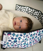 Designed for calm in the pram and tummy time, Etta Loves Reversible Baby Sensory Strips are made from organic cotton with a comfy padded fill and reversible sensory patterns to support babies' visual and cognitive development. One side features a high contrast black and white Dalmatian print, while the other has a colourful Blue Leopard spot print.