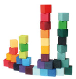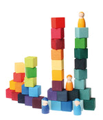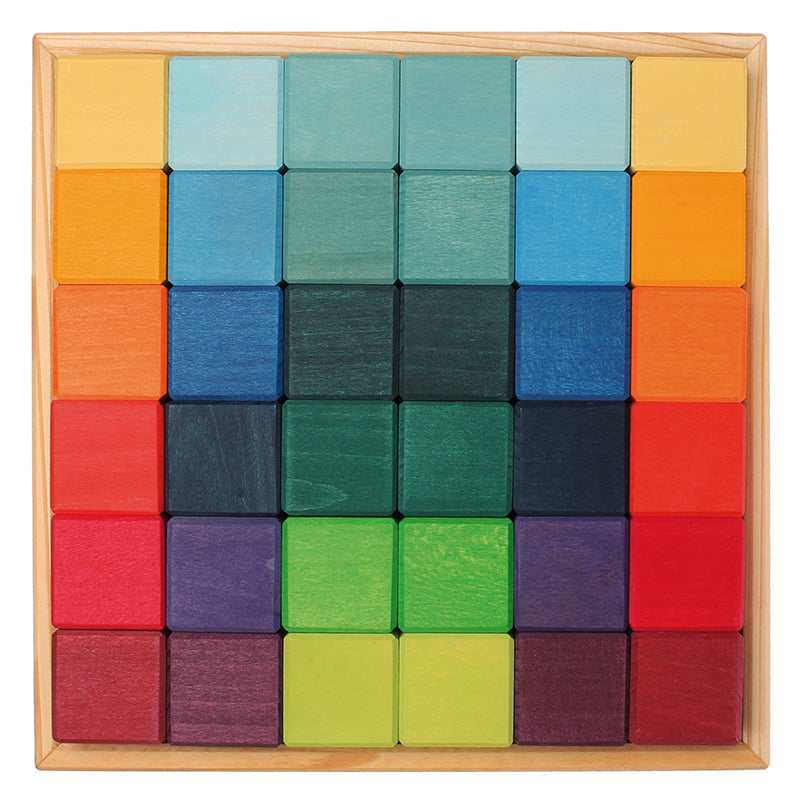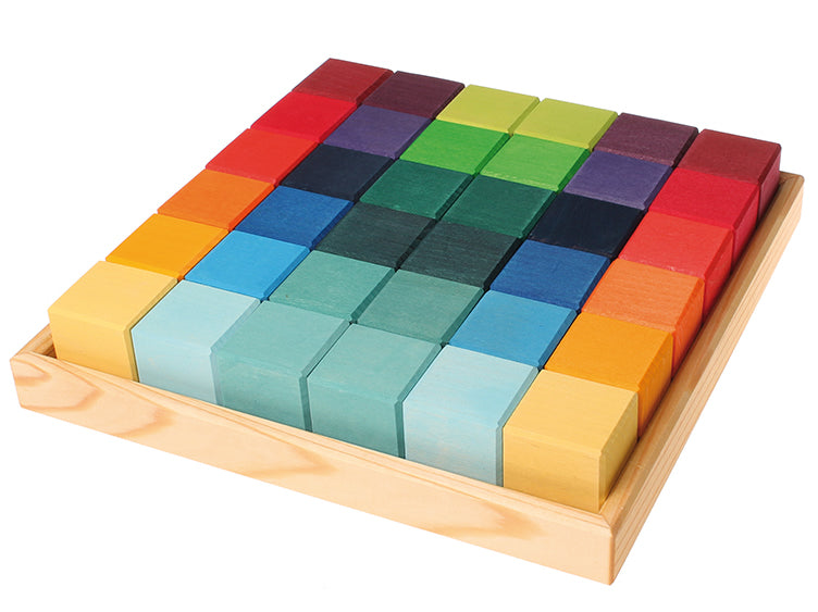 Build, create and learn with this colourful set of 36 wooden rainbow blocks from Grimm's. These wooden cubes are smooth and tactile and a fab toy for open-ended play and unlimited learning possibilities. Stack the blocks up high to make towers and buildings, lay them out flat to create patterns and pictures, use as maths counters, in colour sorting games and as chopped ingredients in a play kitchen. This wooden block set comes in a tray for safe storage and works as a base for building inside. Wooden blocks are an essential traditional toy and will provide hours of fun and learning through play in any playroom or classroom. Beautiful, simple and non-prescriptive, parents and educators interested in Waldorf Steiner and Montessori education will love these blocks as much as children do.