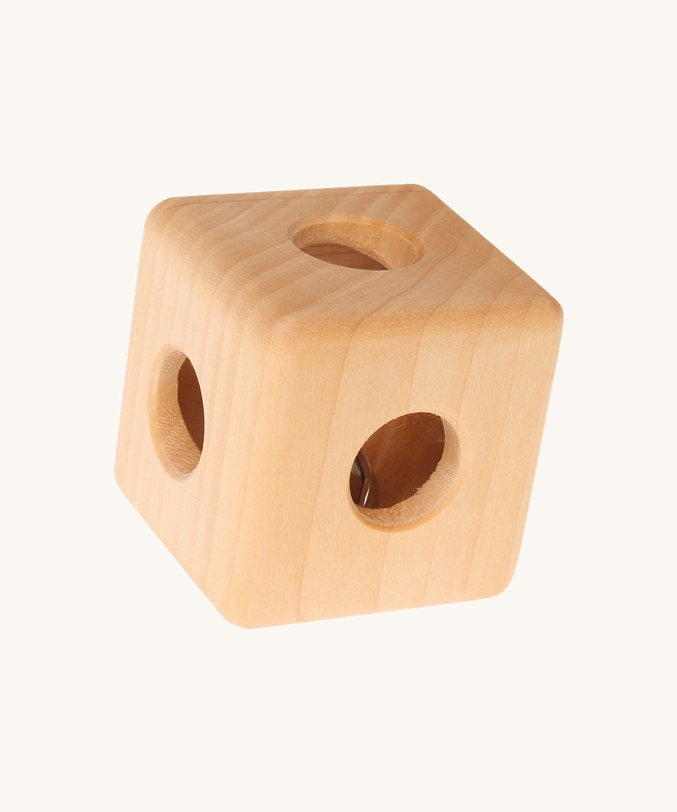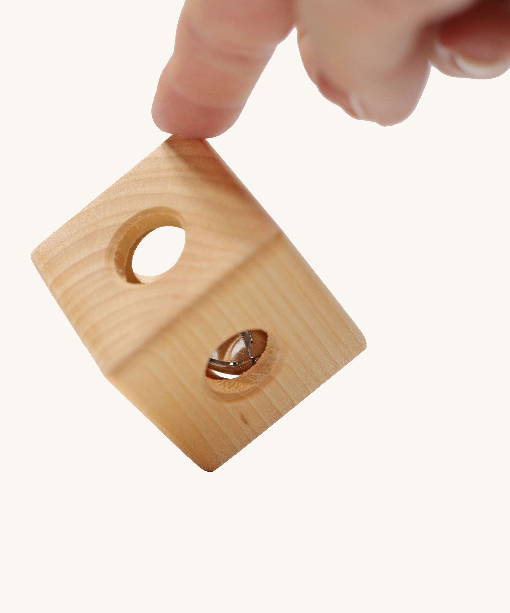• Made up of a wooden cube with cut-outs with a jingling bell inside.