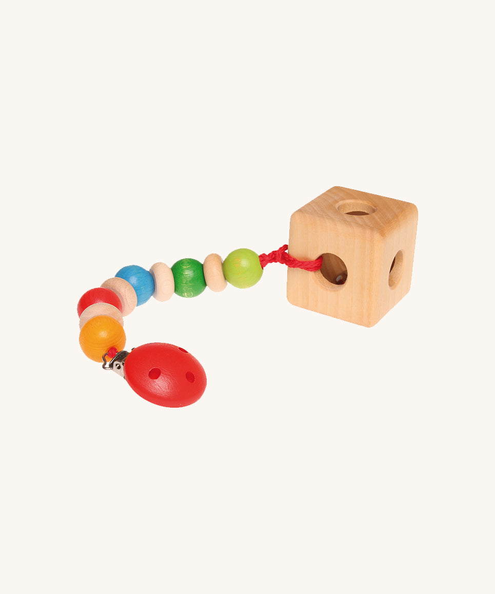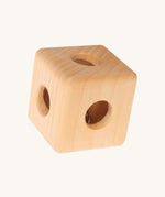 This natural wooden baby rattle is cube-shaped with cut-outs on the faces to let the sound of a jingling bell ring out. This solid wood baby toy is a perfect first toy and will appeal to babies' senses of touch, sight, sound, sensation and taste. This wooden cube rattle is a lovely grasping toy for a new baby and it will appeal to green parents who are looking for natural, ethically made baby toys in the Waldorf Steiner tradition. This natural wooden rattle is smooth, tactile and perfect for small fingers to grab hold of and shake, and is a safe teething toy for aching gums. Expertly hand-crafted from sustainable, solid wood, this eco baby toy is just the right size for tiny hands. New babies will enjoy exploring the shapes and taste of the natural wood, making this a perfect first sensory toy and natural, safe teether. Keep it safe by attaching it to a pacifier chain or add to a nursing necklace to keep baby entertained.