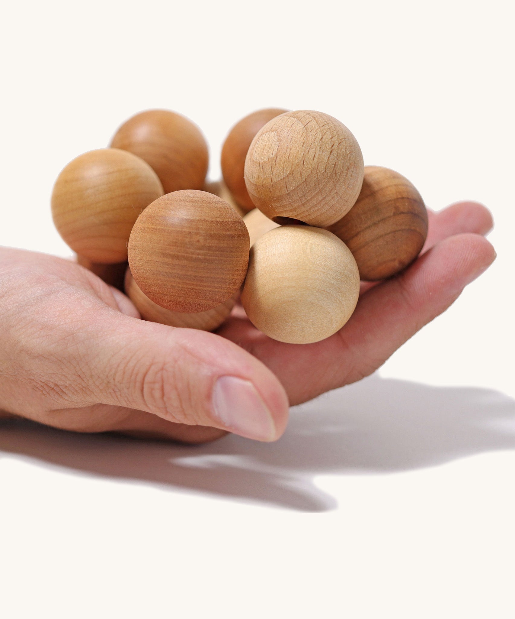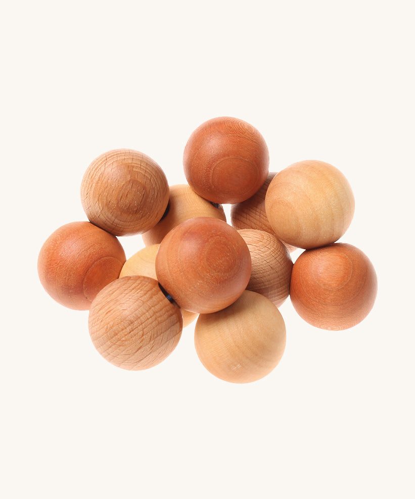 This beautifully natural baby toy is comprised of twelve wooden balls, tightly strung together with strong heavy elastic. It is a wonderful present for a new baby and will be loved as soon as baby starts grasping items. Babies love to roll the balls over each other and shake this mesmerising toy, and its compact size makes it perfect for popping into a changing bag for entertainment on the go.