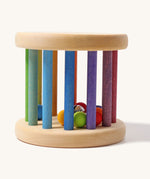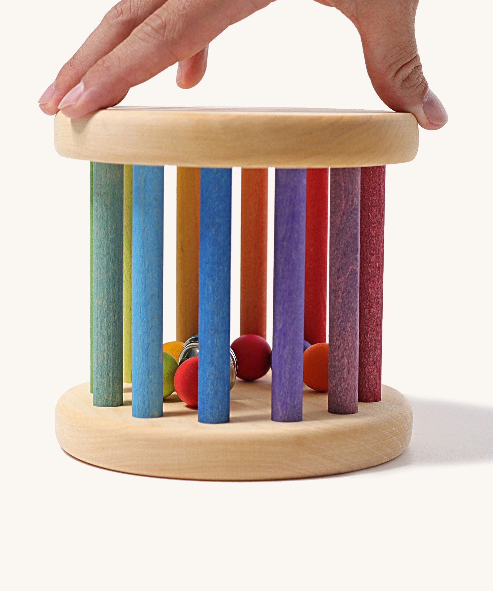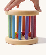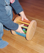 The Grimm's Rolling Rainbow Wheel is quite a large chunky and beautiful rolling toy for toddlers. It consists of a cylinder made up of two wooden discs, each measuring 15cm across, connected by rainbow-coloured spindles. To make it extra fun for little ones, coloured wooden balls and a bell are trapped inside which makes a tinkling sound as it moves. This is a stunning toy that children will love to play with, roll and chase after.