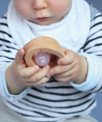 This Grimm's Rose Quartz Baby Rattle is a natural wooden baby rattle with a spinning semi-precious roze quartz stone in the middle. This sensory baby toy is smooth and tactile, and the contrasting feel of warm alder wood and the cold stone will appeal to little fingers and the rattling sound will delight babies too. Alder wood has a beautiful grain and the natural plant-based oil brings out its warm tones. This natural finish makes this a safe teething toy for little babies. Keep it safe by attaching it to a pacifier chain or add to a nursing necklace to keep baby entertained. This wooden baby toy is a classic toy for new arrivals and makes a lovely new baby gift or baby shower present. Green parents and babies alike will love this wooden rattle.